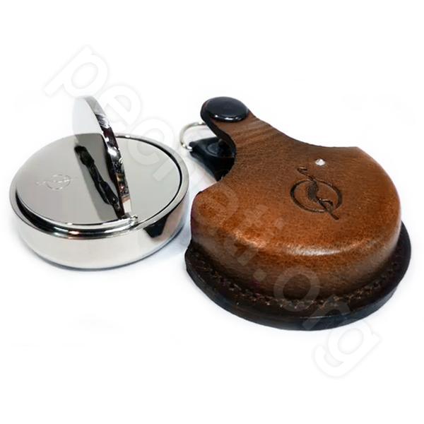 Карманная металлическая оснастка для круглой печати со встроенной штемпельной подушкой синего цвета, клеевым слоем для крепления клише печати. Никелированная. В комплекте чехольчик из натуральной кожи  для возможности ношения на карабине.
